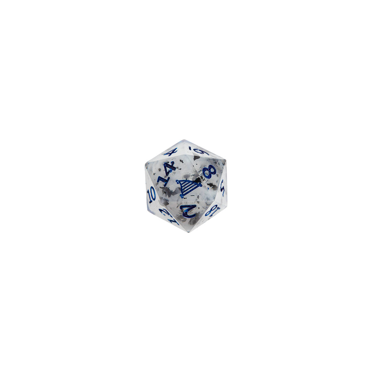 Embody the quiet strength and storm-blessed grace of Yasha Nydoorin at level 20 by rolling these beautiful math rocks crafted from clear sharp edged epoxy resin with light gray swirls. They’re gorgeously contrasted by black foil flakes and deep dark blue numbering that elegantly echoes Yasha’s calm and powerful presence. The d20 is crowned with a bone harp symbol on the 20 face—a striking emblem representative of the resilient Mighty Nein hero.