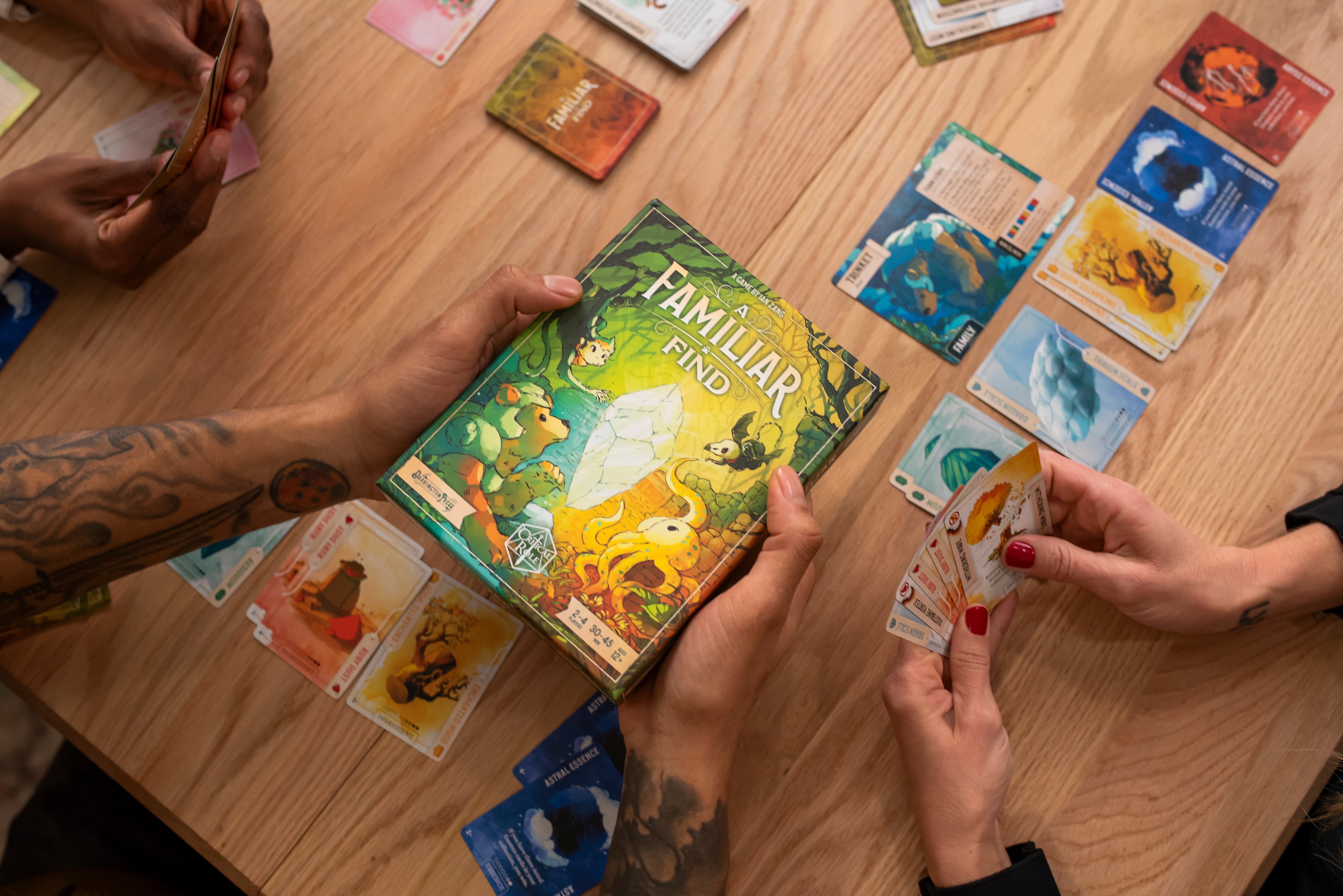 A Familiar Find offers quick turns, easy-to-learn rules, and a wealth of surprises that ensures every game is a new adventure. The game includes 84 Arcane Cards and 13 Location options, providing various effects and opportunities. Jump into the game as a fan-favorite familiar from Critical Role Campaigns 1-3, or take your pick of 10 different Familiar Boards, each with cool, unique powers! You'll need smart moves and a sharp eye on your rivals to be the first familiar to snag all the ingredients and help your caster finish their spell.