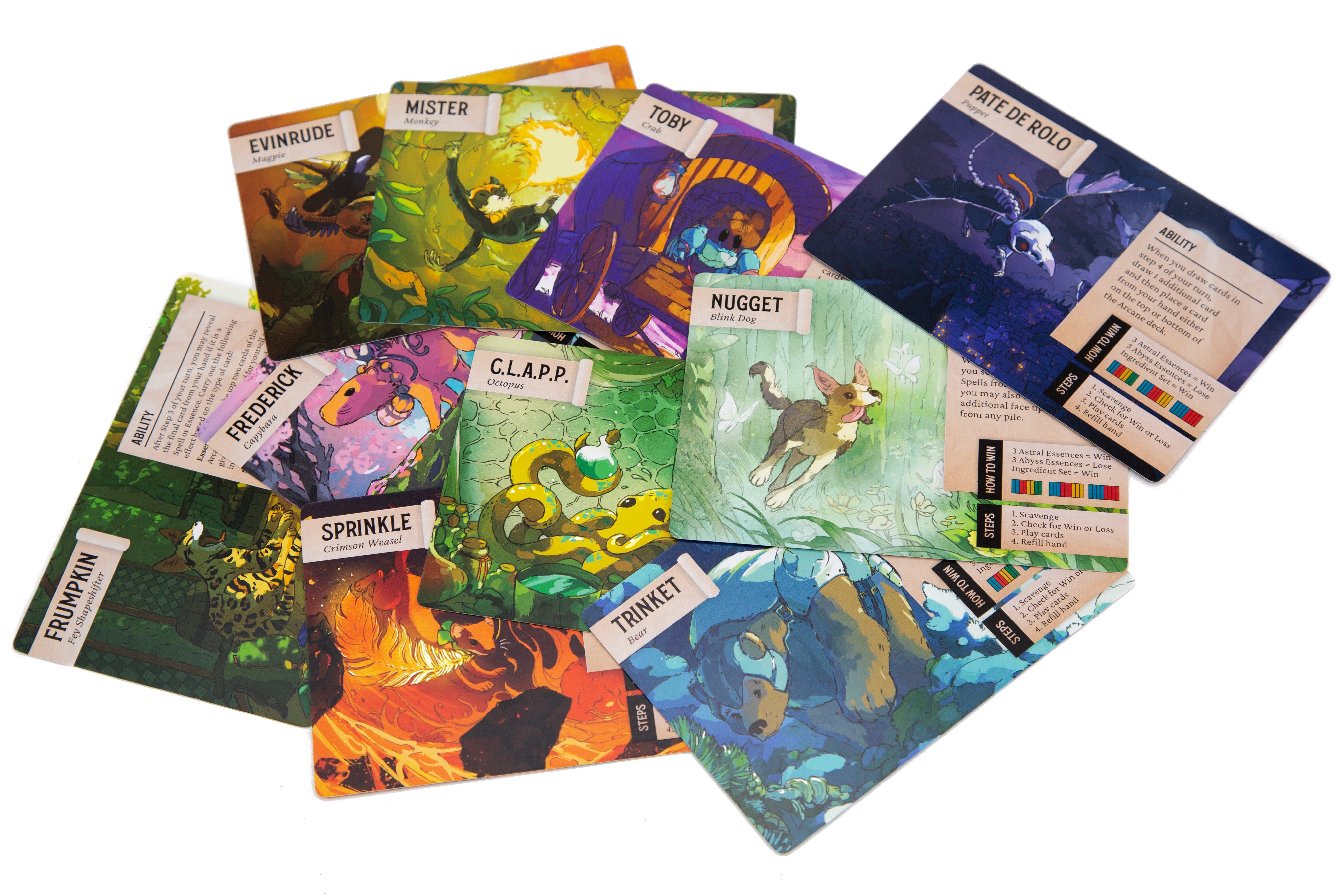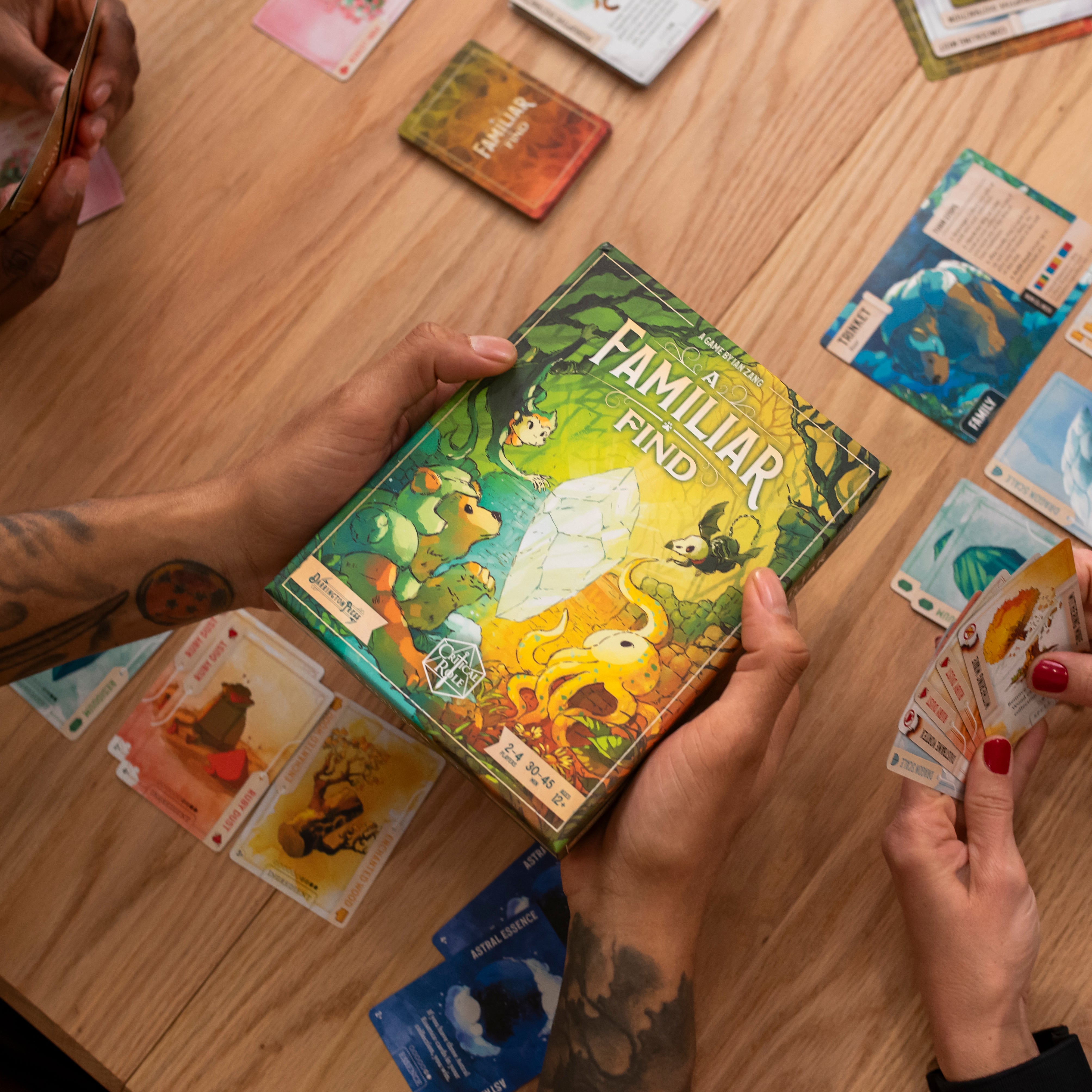 A lighthearted card game designed for up to four participants. Players assume the roles of animal familiars within Exandria™, tasked with seeking out rare spell ingredients. Utilize powerful spells and your own wits to lay traps and disrupt your opponents’ progress. Ten Familiar Character options are available, including Trinket the Bear, Mister, and Pâté de Rolo from Critical Role Campaigns 1-3. To win the game a player has to accumulate three Astral Essence cards or one complete set of Ingredients.